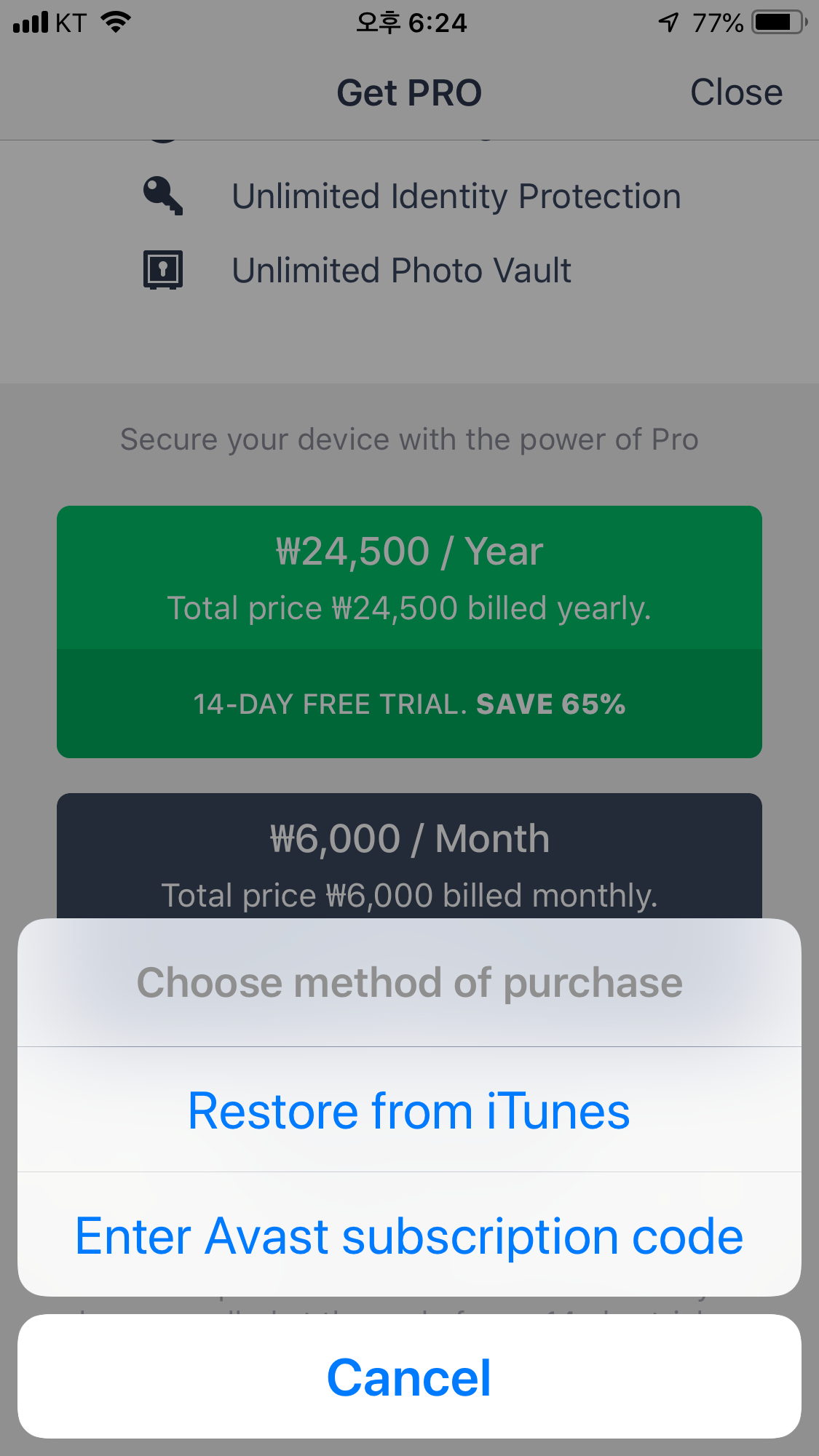 iOS용 Avast Security Protection 제품 라이선스 등록 과정은 다음과 같습니다.