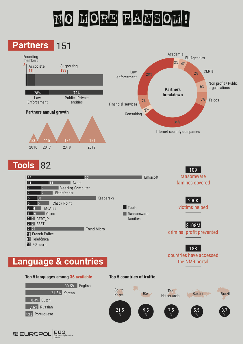 약 150개 협력사가 참여한 본 프로젝트는 2016년에 출범하였고 전체 82개의 복호화 도구를 발표하였습니다. 이 중에 엠시소프트는 32개의 복호화 도구를 만들어 가장 큰 기여를 하였습니다.