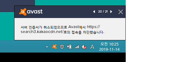 경고창은 "서버 인증서가 취소되었으므로 Avast에서 https://사이트명으로의 접속을 차단했습니다" 이란 내용입니다. 경고창 이미지는 아래와 같습니다.