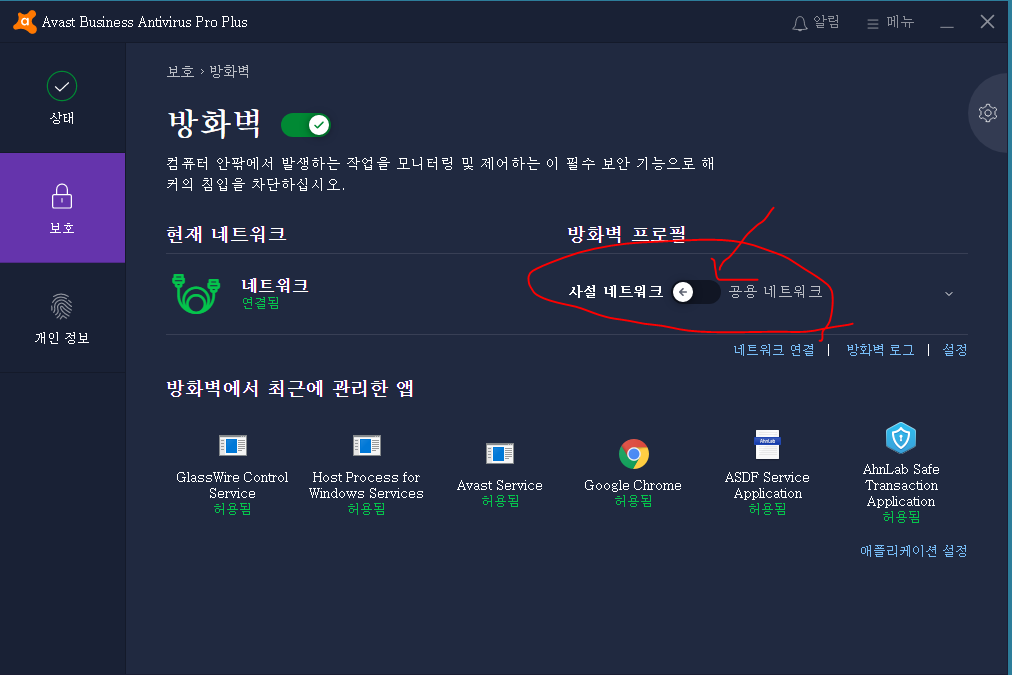 기본 방화벽 설정이 공용 네트워크로 되어 있기 때문에 Avast 방화벽은 엄격한 방화벽 규칙을 사용하게 되어 업무 프로그램의 많은 부분을 차단하고 이는 사용자들의 불편을 가져오게 됩니다. 물론 불편이 크면 클수록 보안은 강화되는 것입니다만, 개별 PC의 방화벽은 중앙설정을 따르지않고 개인이 설정하도록 변경하면 개인 스스로 사설 네트워크와 공용 네트워크를 필요에 따라 선택하여 사용할 수어 편할 수 있게 됩니다.