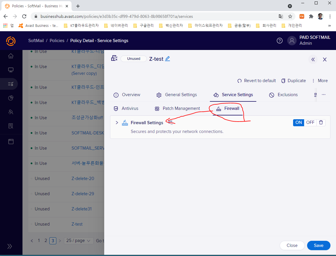 2. 좌측의 Policies에서 설정한 정책을 클릭하여 service settings > Firewall을 클릭합니다.