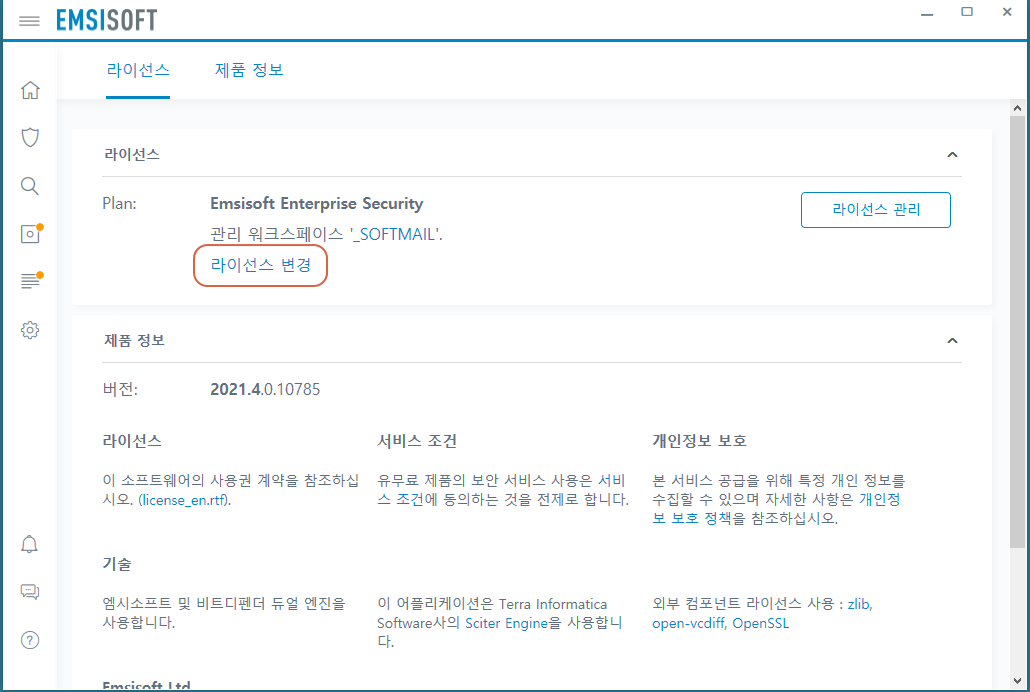 2. 라이선스 메뉴 상에서 라이선스 변경 메뉴를 클릭합니다.