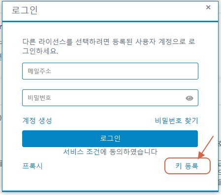 3. 로그인 창이 나타나면 우측 하단의 [키 등록] 메뉴를 클릭합니다. 참고로 업무용 중앙관리의 경우 중앙관리 버전으로 설치하고자 하는 경우 관리자 메일주소와 비밀번호로 로그인하여 등록할 수 있습니다. 그러나 일반적인 경우 [키 등록] 메뉴를 통해 활성화코드를 등록하시면 됩니다.