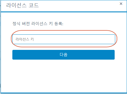 4. 키 등록을 누르면 라이선스 코드 입력 창이 보이는데 라이선스 키 입력창에 부여 받은 활성화코드를 등록하여 다음 버튼을 누르면 활성화되어 바로 정품으로 등록사용이 가능합니다.