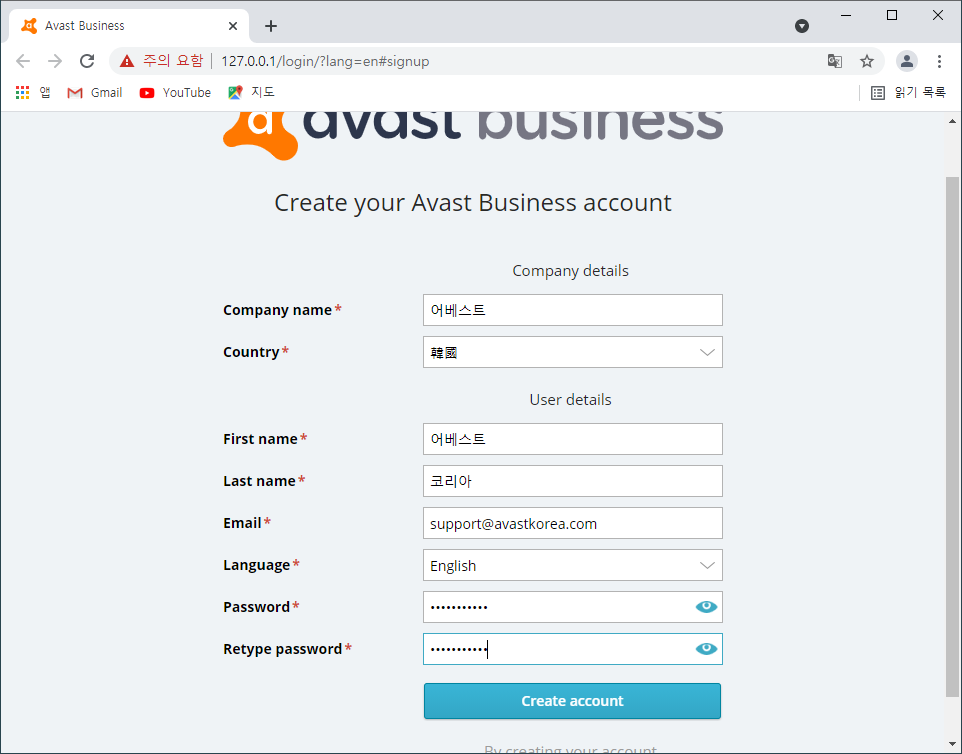 다음으로 넘어가면 Avast 설치형 중앙관리 콘솔 페이지가 나오고 최초 페이지 접속시 등록과정을 거쳐야 합니다. 등록은 회사명, 국가(한국), 이름과 성, 그리고 메일주소, 언어(Englsih), 비밀번호를 입력하고 Create account 버튼을 눌러 첫 등록을 완료하여야 합니다. 콘솔의 언어는 한국어가 지원되지 않기 때문에 영어(English)를 선택합니다. 이메일 주소와 비밀번호는 본 콘솔에 로그인하기 위한 로그인 정보이므로 정확하게 입력하시고 반드시 기억하셔야 합니다.