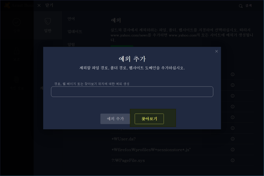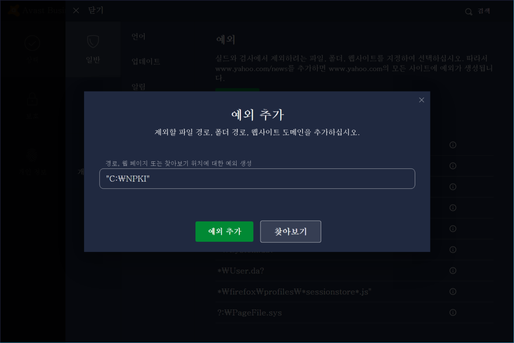 - 찾아보기 버튼을 눌러 예외처리할 경로를 지정