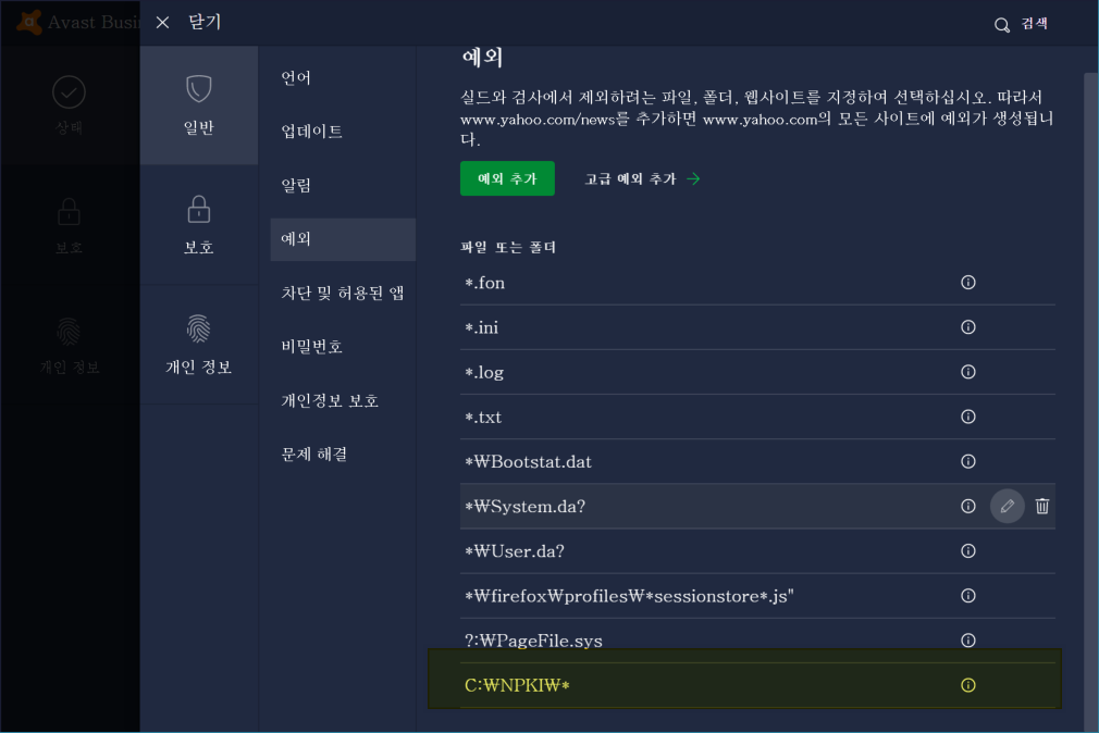 - 일반의 예외 메뉴 클릭하여 예외 추가 버튼 클릭