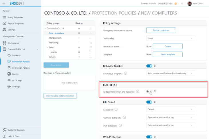 새로운 위협 탐지 기능을 최초로 테스트하고 싶다면 보호 그룹 정책 또는 Emsisoft Management Console의 개별 장치 설정에서 새로운 EDR 기능을 활성화할 수 있습니다. 이 기능 사용은 엠시소프트 콘솔 https://my.emsisoft.com 에 로그인하여 사용하실 수 있습니다.