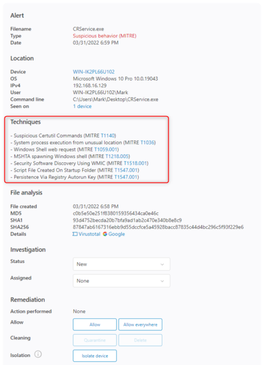 새로운 확장 프로세스 액티비티 분석 기능은 잠재적인 위협을 검출 및 강조 표시하는 광범위한 MITRE ATT&CK 패턴을 지원하며 대응에 대한 완전한 제어를 제공합니다. 클릭 한 번으로 작업 공간의 모든 장치에서 위협을 차단 및 검역하거나 특정 파일을 화이트리스트에 표시하여 향후 경고를 방지할 수 있습니다.