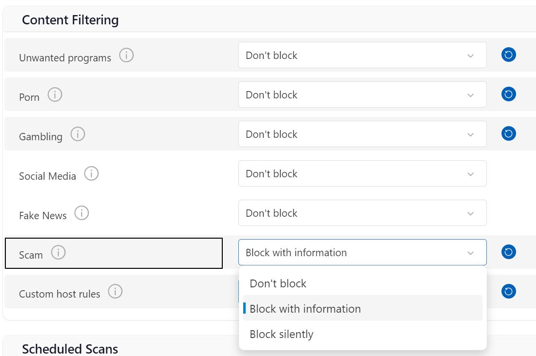 EMSISOFT 안티 스캠을 활성화하려면, 클라우드 대시보드에 접속하여 Protection Policies 메뉴의 Content Filtering 섹션에서 scam 콤보박스를 Don't block에서 Block 메뉴로 변경하여야 합니다. 정책이 활성화되면 엔드포인트의 EMSISOFT에서는 안티 스캠이 활성화됩니다.