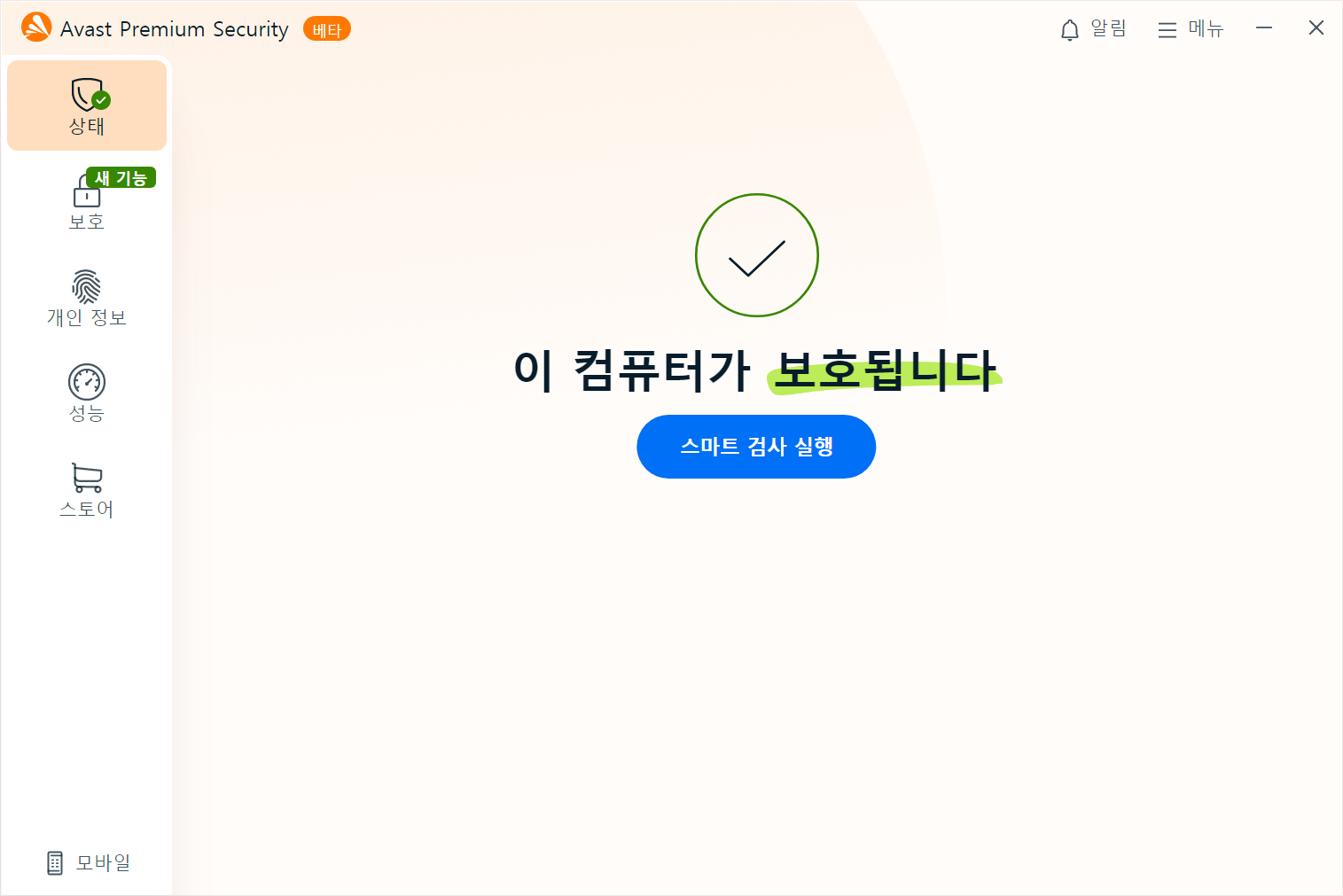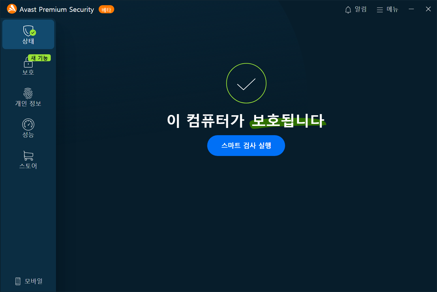 이 테마는 AVAST 베타에서 사용하실 수 있으며 일부 PC에서 일부 화면에 테마가 적용되지 않을 수 있습니다.