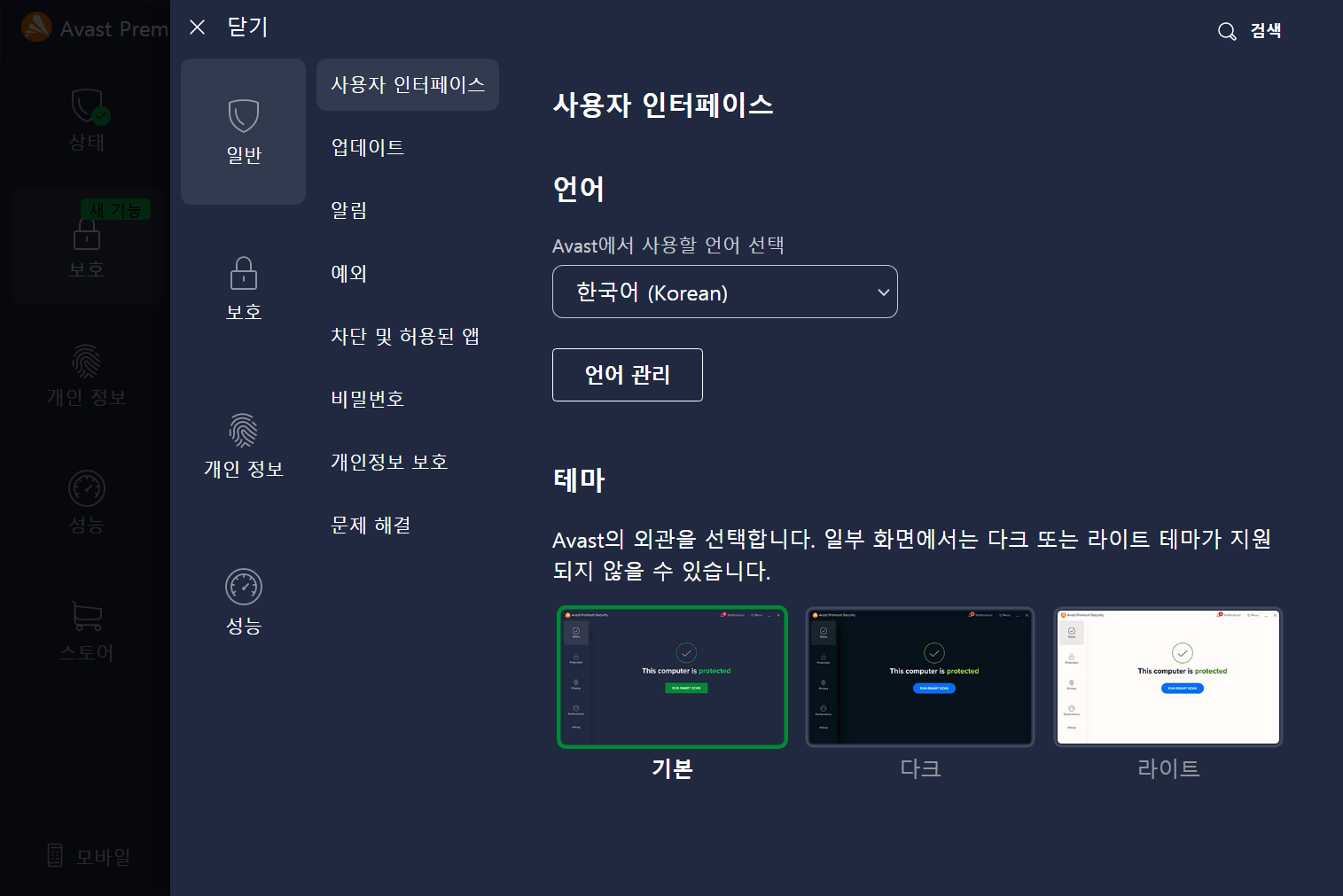 AVAST 테마 설정은 AVAST 설정메뉴의 일반 탭에서 사용자 인터페이스 메뉴에서 테마 선택이 가능합니다.
