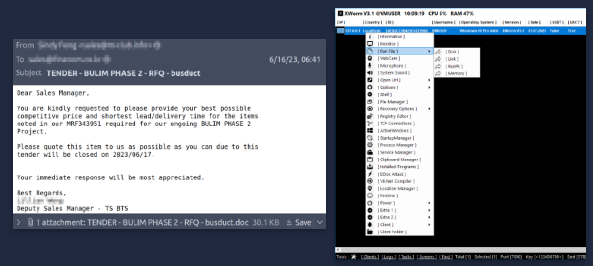 왼족 이미지는 당사에서 생성한 것이 아닌 실제 웹메일 발견한 RAT 공격 샘플입니다. 우측 이미지는 AVAST에서 생성한 실제로 해커가 사용하는 도구의 화면입니다. (표시된 상표 또는 로고는 해당 브랜드의 등록 상표)