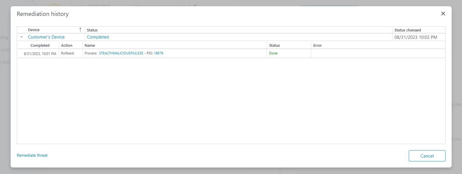 시스템을 이전 상태로 되돌려야 하는 경우 작업 공간의 사고 패널로 이동하여 사고를 선택하고 '복구' 버튼을 클릭하면 됩니다. 해당 사고에 대해 롤백을 사용할 수 있는 경우 "복구" 대화 상자에 신뢰할 수 없는 프로그램이 변경한 내용을 취소하는 데 필요한 옵션이 제공됩니다.