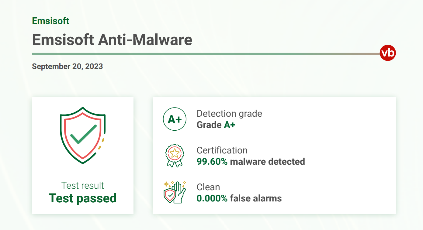 우리는 Emsisoft Anti-Malware가 기대치를 능가했다는 사실을 보고하게 된 것을 자랑스럽게 생각합니다. 이 소프트웨어는 1,772개의 악성 샘플 중 99.60%를 성공적으로 식별했으며, 동시에 0.000%의 오탐률을 유지했습니다. 이 인상적인 성능으로 Emsisoft Anti-Malware는 A+ 등급의 VB100 인증을 받았습니다.