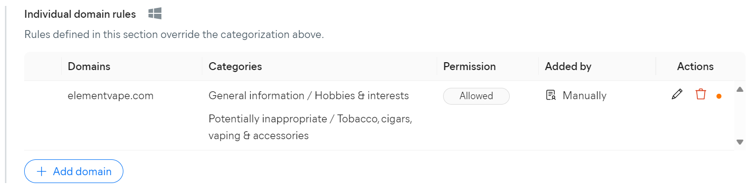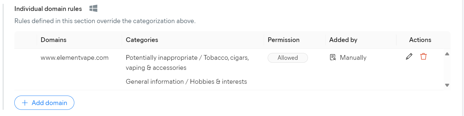 Individual domain rules에 차단된 URL을 허용 설정하면 사이트 접속이 허용됩니다.