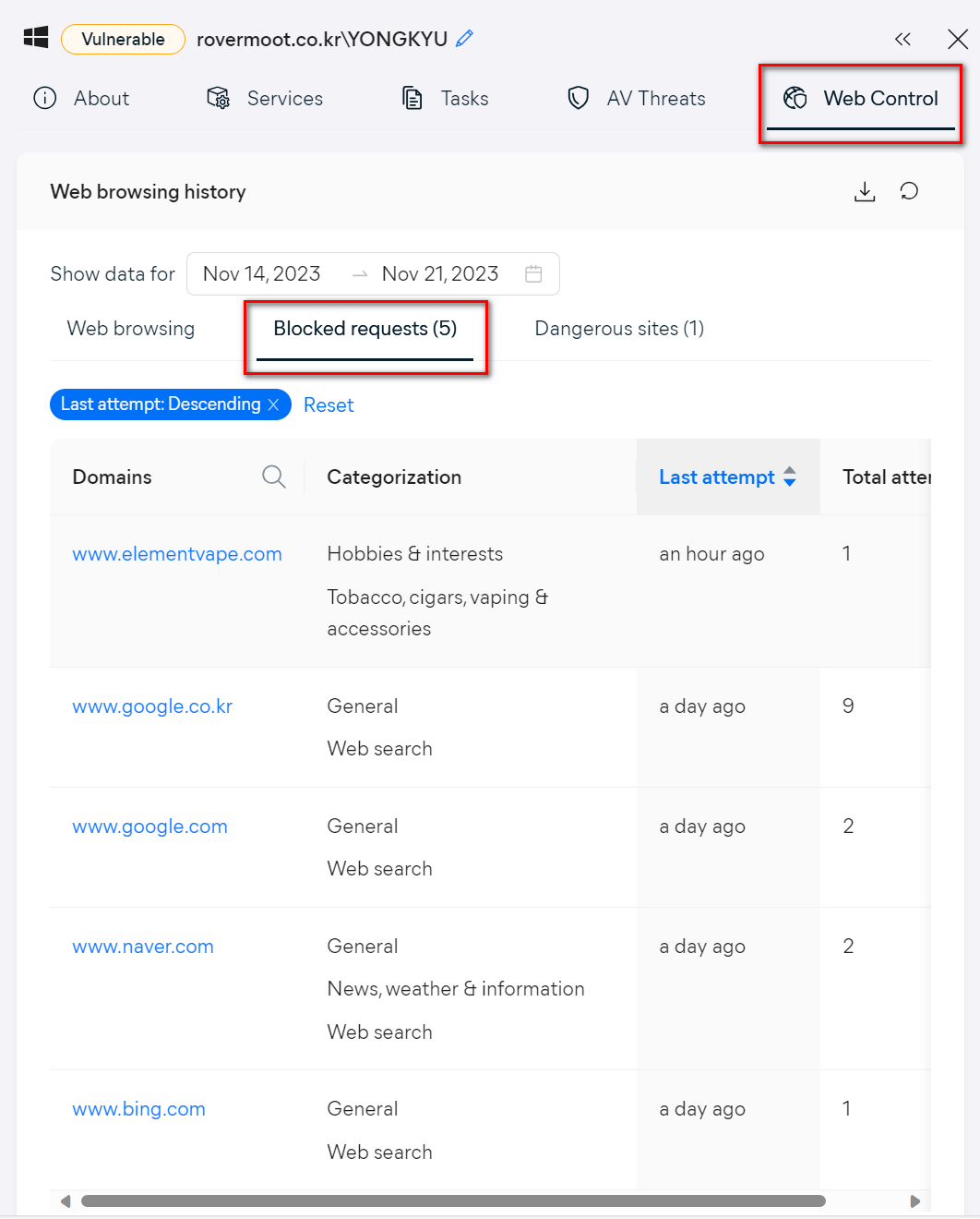 Business Hub에 등록된 Device를 클릭하여 표시되는 정보화면의 Web Control 메뉴에서 웹 접속 카테고리 별 정보와 차단된 웹사이트 리스트 등을 확인할 수 있습니다.