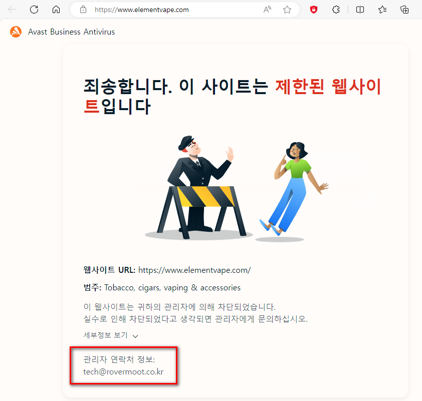 Potentially inappropriate 카테고리 차단에 따라 전자담배 판매 사이트 접속이 차단됩니다. 페이지 마지막에 설정한 이메일 주소(tech@rovermoot.co.kr)가 표시됩니다.