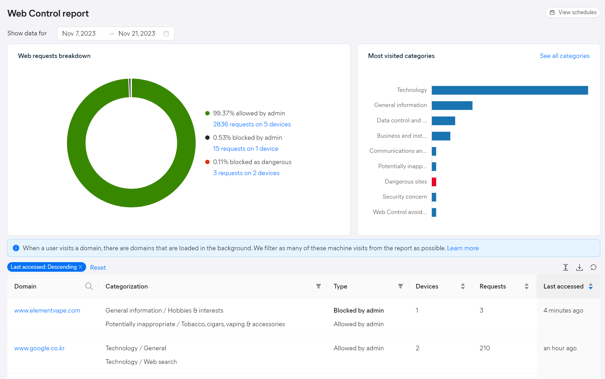 이제 보고서 페이지(다중 테넌트 허브의 사이트 보기)에 새 웹 컨트롤 보고서가 포함됩니다. 이는 관리되는 장치의 검색 동작에 대한 통찰력을 제공합니다.