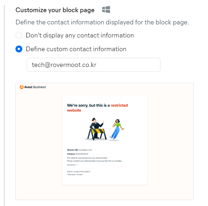 Web control 차단 시에 표시되는 페이지에 이메일 주소 또는 전화번호를 입력할 수 있습니다.