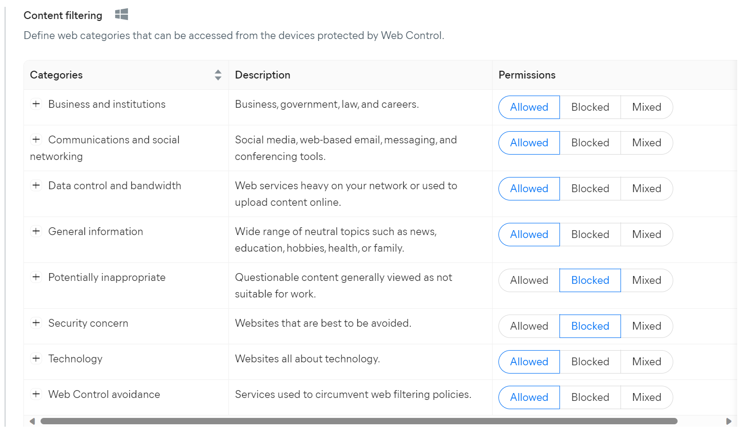 카테고리 및 세부 카테고리 별로 허용/차단을 설정합니다. (초기값은 전체 카테고리 Allowed 설정입니다.)