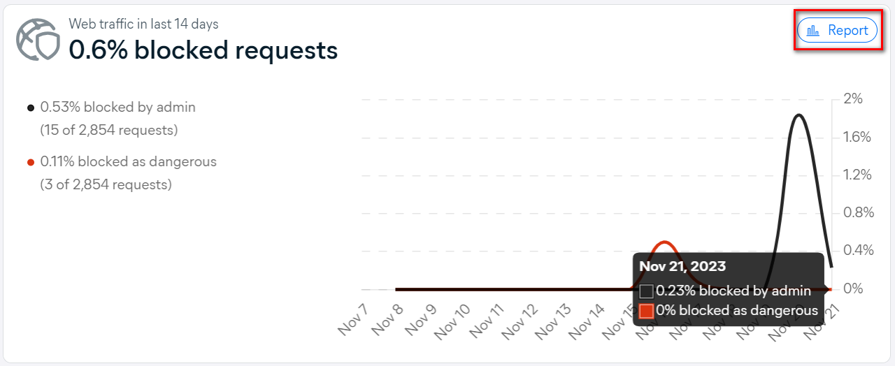 Business Hub 대시보드에서 웹 차단 상태를 그래프로 표시해주며 리포트 정보를 확인할 수 있습니다.