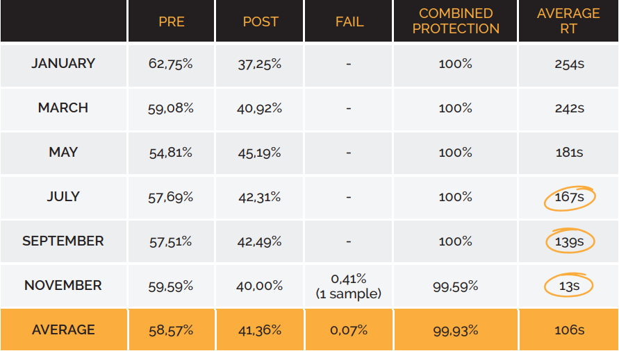2023년 Emsisoft는 Advanced In-The-Wild Malware Tests의 6개 버전 모두에 참여하여 맬웨어 탐지 및 예방 분야에서 비교할 수 없는 능력을 입증했습니다. Windows 운영 체제 보안에 대한 확고한 의지로 Emsisoft의 소프트웨어는 일련의 맬웨어를 능숙하게 처리하여 이러한 위협을 차단할 수 있는 능력뿐만 아니라 중요한 시점(실행 전이나 실행 직후)에도 이를 차단할 수 있는 능력을 보여주었습니다.