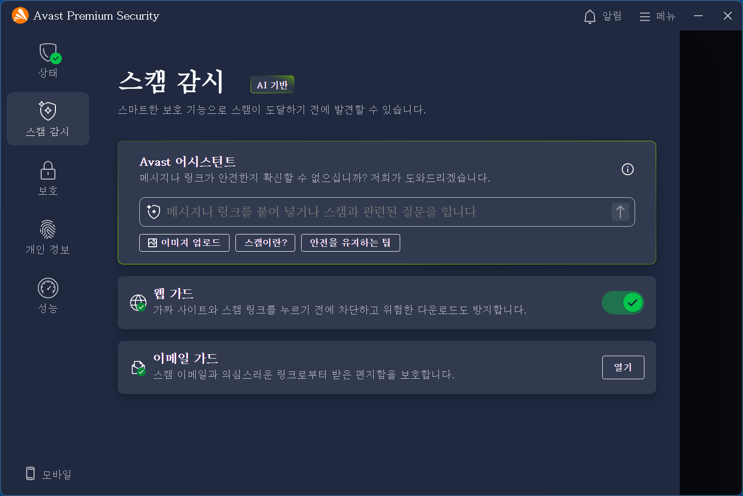 사용하는 방법은 AVAST를 최신 버전으로 업데이트하고 재부팅하면 메인 메뉴 좌측에 스팸 감시 메뉴가 활성화됩니다.