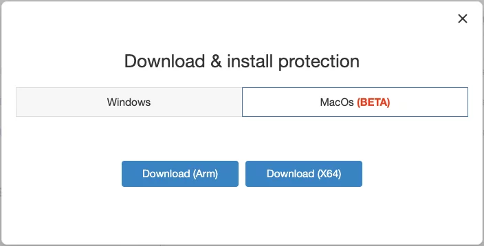 워크스페이스에 로그인하여 Mac에 에이전트를 설치하세요. 이제 다운로드 대화 상자에 macOS가 포함됩니다. 다운로드는 맥의 CPU 종류에 따라 Arm용 및 X64용 설치파일 2종류를 제공합니다.
